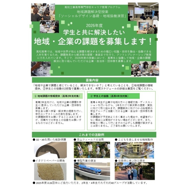 ⾼知⾼専では、地域や世界が抱える課題を解決するための幅広い知識・技術を融合・協働できる⼈材を育てるため、課題発⾒から解決策の提案・実装までを⾏う、「アントレプレナーシップ教育」に⼒を⼊れています。 そこで、2026年度の授業において、⾼専⽣と協働して地域・企業の課題解決に取り組んでいただける企業・