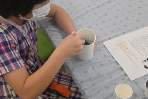 前半の「泳ぐスライム⁉」では、各自がつくったスライムを水に入れて実験したり、楽しみながら科学実験を行いました。