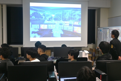 今回S棟4階セキュリティ演習室を会場に、防衛省の事務官2名が「防衛省・自衛隊とサイバー業務について」と題して、日本が標的になるサイバー攻撃の懸念や、それらへの対策、防衛省・自衛隊員の日々の業務内容等について説明を行いました。