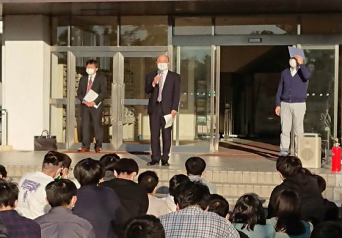 訓練終了後の井瀬校長からの挨拶の中では、学生達に南海トラフ地震に関する質問があり、学生達は津波浸水の到達時間や高さを正しく答えていました。