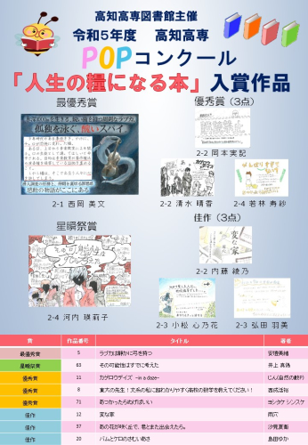 令和5年度高知高専POPコンクール 「人生の糧になる本」が行われ、8作品の入賞作品が選ばれました。